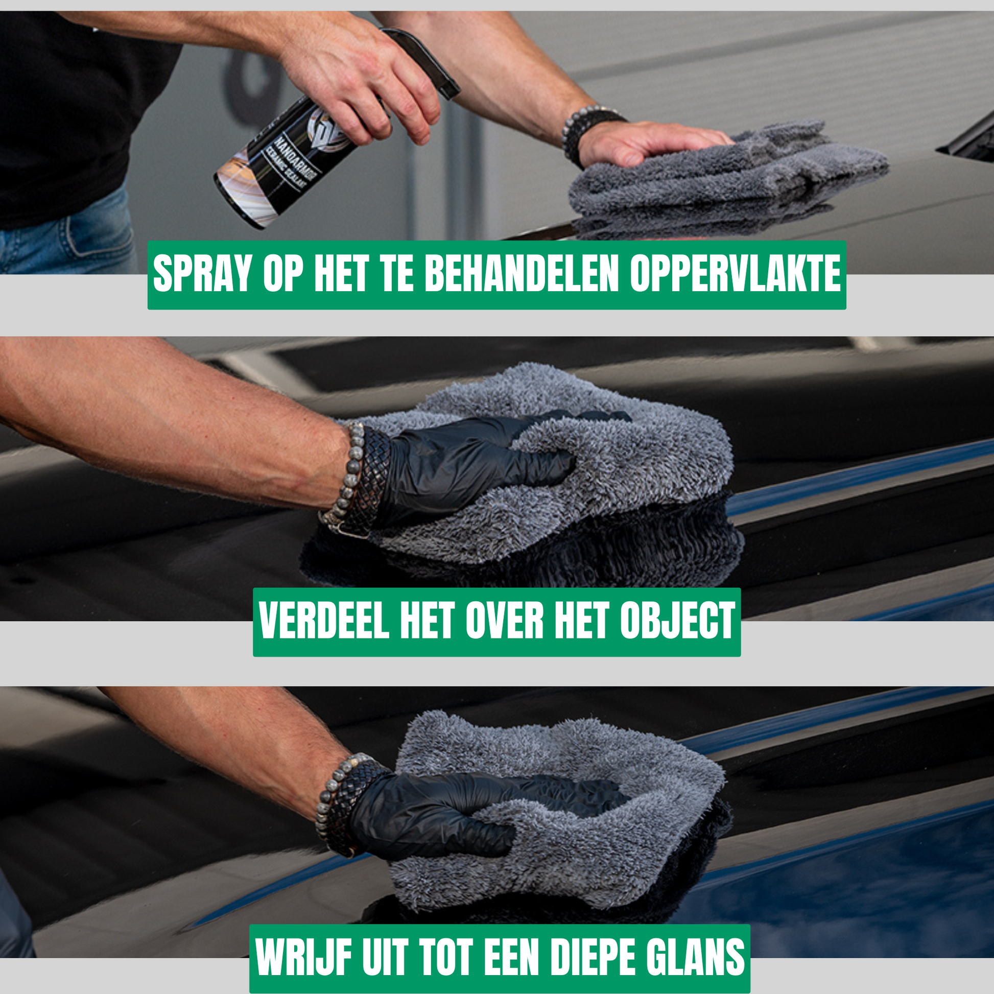 Stap 3: Spray 1-2 keer gelijkmatig over het te behandelen oppervlak en op een zachte microvezeldoek.