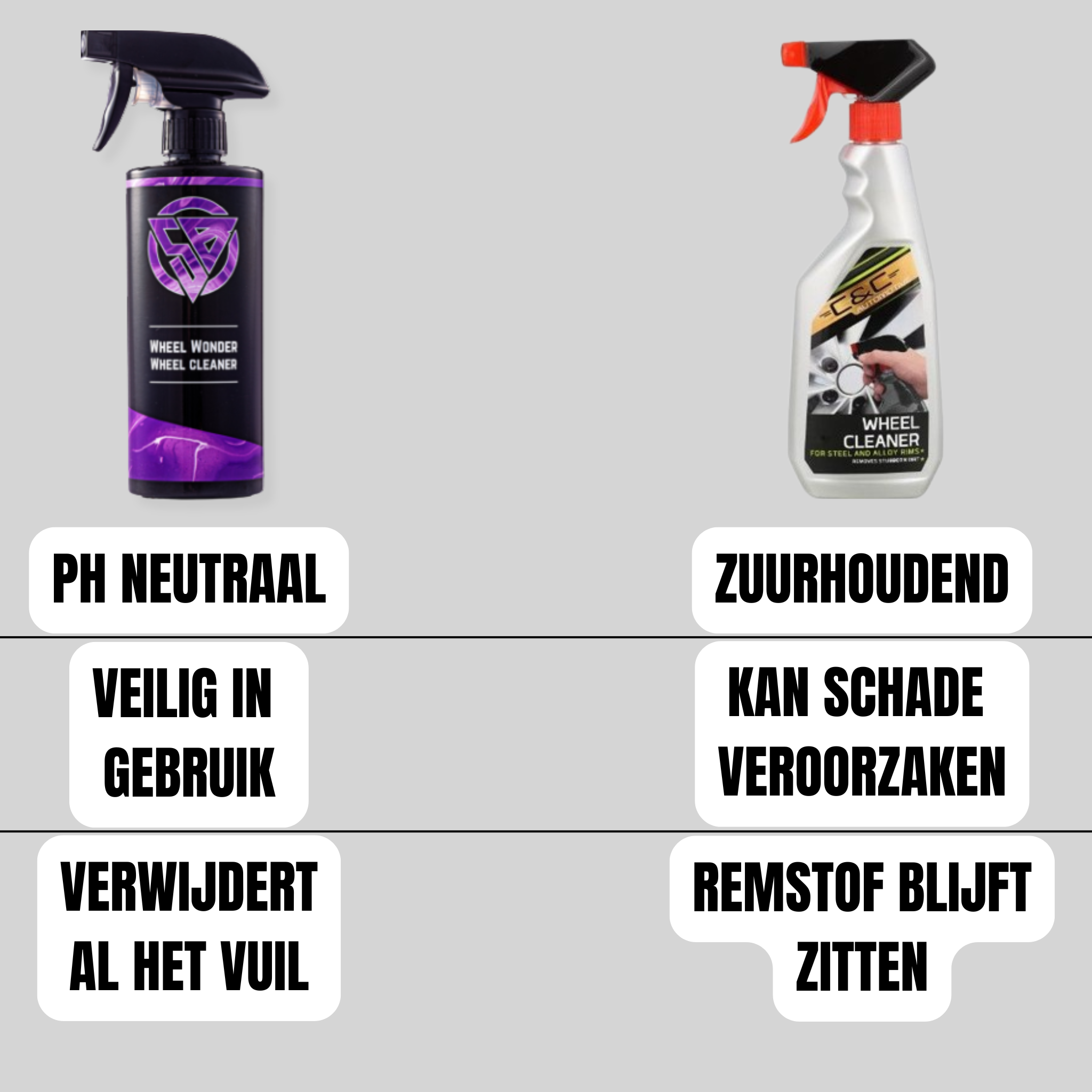 Wheel Wonder is een krachtige maar veilige ph neutrale velgen reiniger. Andere velgen reinigers hebben zuur en kunnen je velgen aantasten, maar Wheel Wonder niet. Onze ph-neutrale formule verwijdert fijn remstof op een veilige manier.
